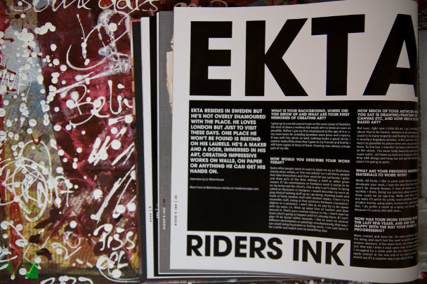The 250 pages hard back book contains features about several urban artists, illustrators and photographers like JR, Os Gemeos, Adam Neate, Space Invader, Blu, Ruedi One and Mark Jenkins, organized by the categories Spy, Rider’s Ink, Illustrated Works, Inside, Show & Tell, Photo and Random.