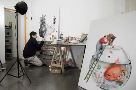 Last year, I got the chance to meet Jakob Tolstrup in his Berlin studio, and photographed him while preparing paintings for his first solo-show in the German capital! I really enjoyed watching him creating those clean, amusing artworks with their more or less hidden messages.